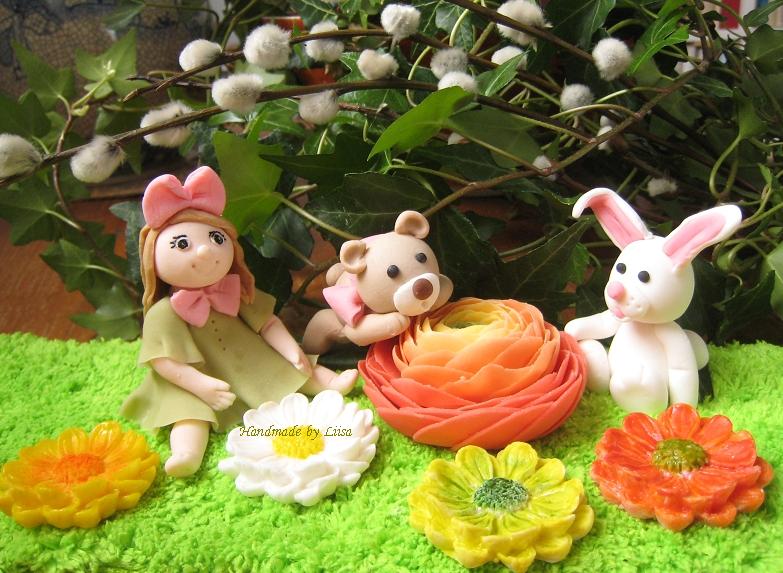 Tässä kukkakedolla sokerimassakaverukset jotka valmistin viime viikonloppuna Marsispossun koristelukurssilla. Olipa hauskaa ja opettavaista! Hahmojen osien kiinnittämiseen käytimme tukina spagetin pätkiä ja kurssilla saimme huimasti muitakin hyviä vinkkejä sokerimassan käsittelyyn ja kakun koristelemiseen.