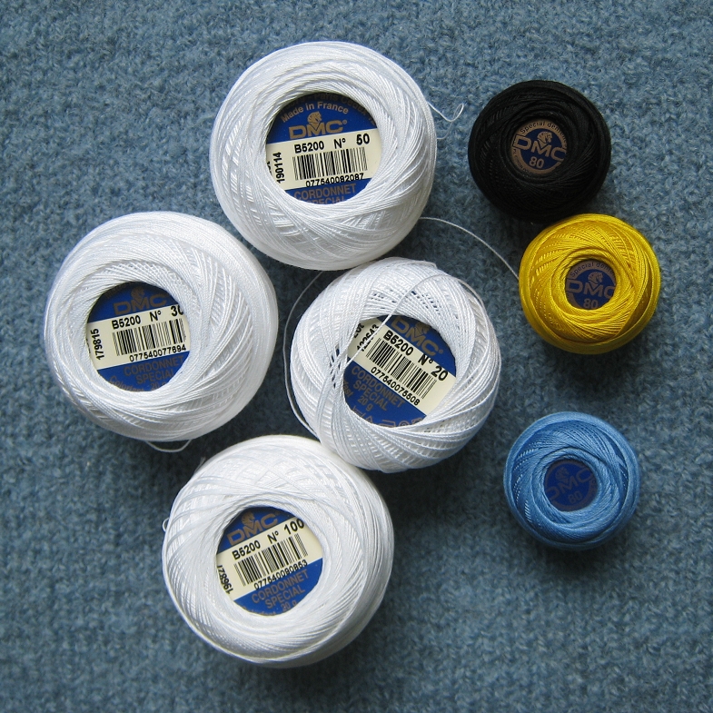 Tässä uusia projekteja varten hankittuja lankoja. Nämä DMC:n käsityölangat ovat juuri sopivia käpypitsin tekemiseen – tarpeeksi kierteisiä ja kovia. Aloitin isoimmalla, eli keskimmäisellä 20 numeroisella. Värillisiä oli vain kokoa 80 ja ohuin valkoinen on 100 numeroista. Mihinköhän sellaista voisi laittaa? Harmi ettei damastinenäliinoja enää käytetä! 😉