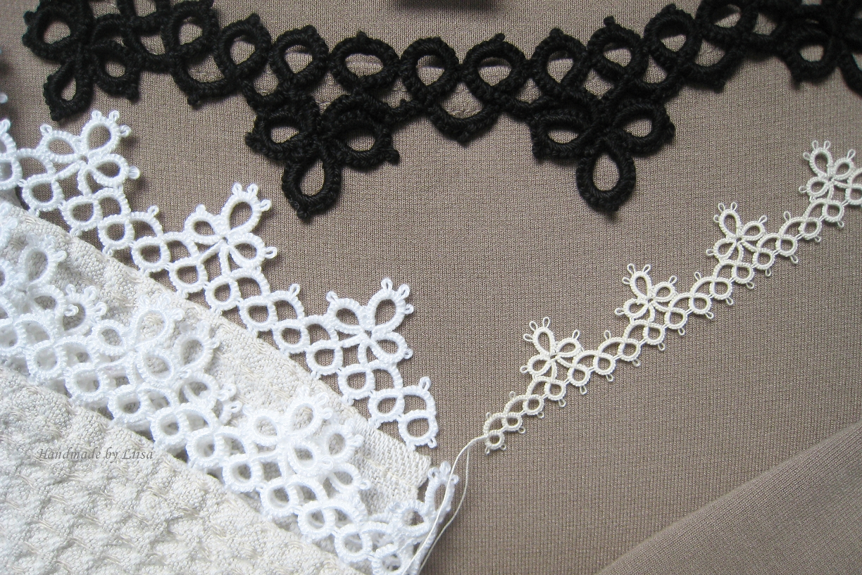 More lace edgings – tatted this time. All three are made with the same pattern. The largest, black lace with thick cotton yarn and a needle. The middle one sewed onto the little linen towel is shuttle tatted in a soft mercerised crochet cotton (needle size 1,25-1,5 mm) and the smallest a try to elaborate a little on my grandmother´s simple pattern in her old nro 70 thread.
