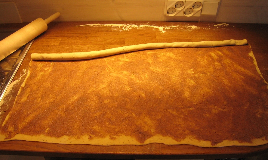 Mix the hand warm milk with the sugar, salt, cardamom and yeast. Whisk in 2-3 dl flour, beating it well to get air into the dough. Add up to 1 litre of the flour little by little, beating and then kneading well. Then add the softened butter, continuing to knead until the dough starts to come off the edges of the bowl. Add flour until you have a soft dough with good viscosity. Leave it to rise to double it’s size, covered, in a warm place. Then knead it again to get rid of air bubbles. With a rolling pin roll out half of the dough into a rectangle, as thin as you can. Mix together the ingredients for the filling and spread on half of it evenly. Roll from the long side and leave the edge underneath. Cut the roll diagonally in a zigzag to form buns. Turn the pieces over onto their longer edge and press a little in the middle. Leave to rise for half an hour, then glaze with beaten egg before baking at 220 C for 10-15 minutes. I usually get about 24 rolls out of this amount. You can also roll the pastry out into a narrower strip and make smaller buns.