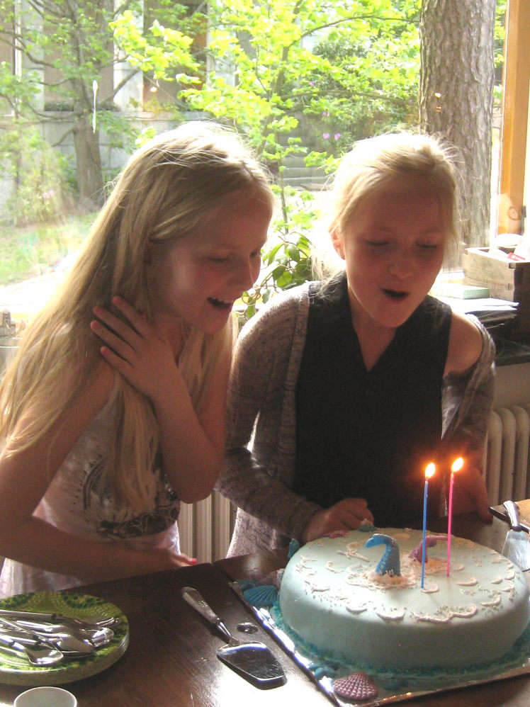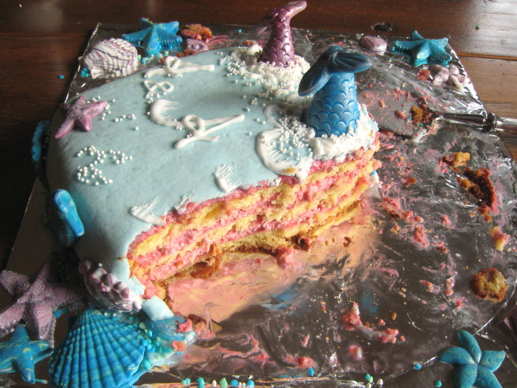 This is a cake I offered to make to try out some silicone molds. It’s a birthday cake for nine year old twins, hence the two mermaids’ tails on top.
