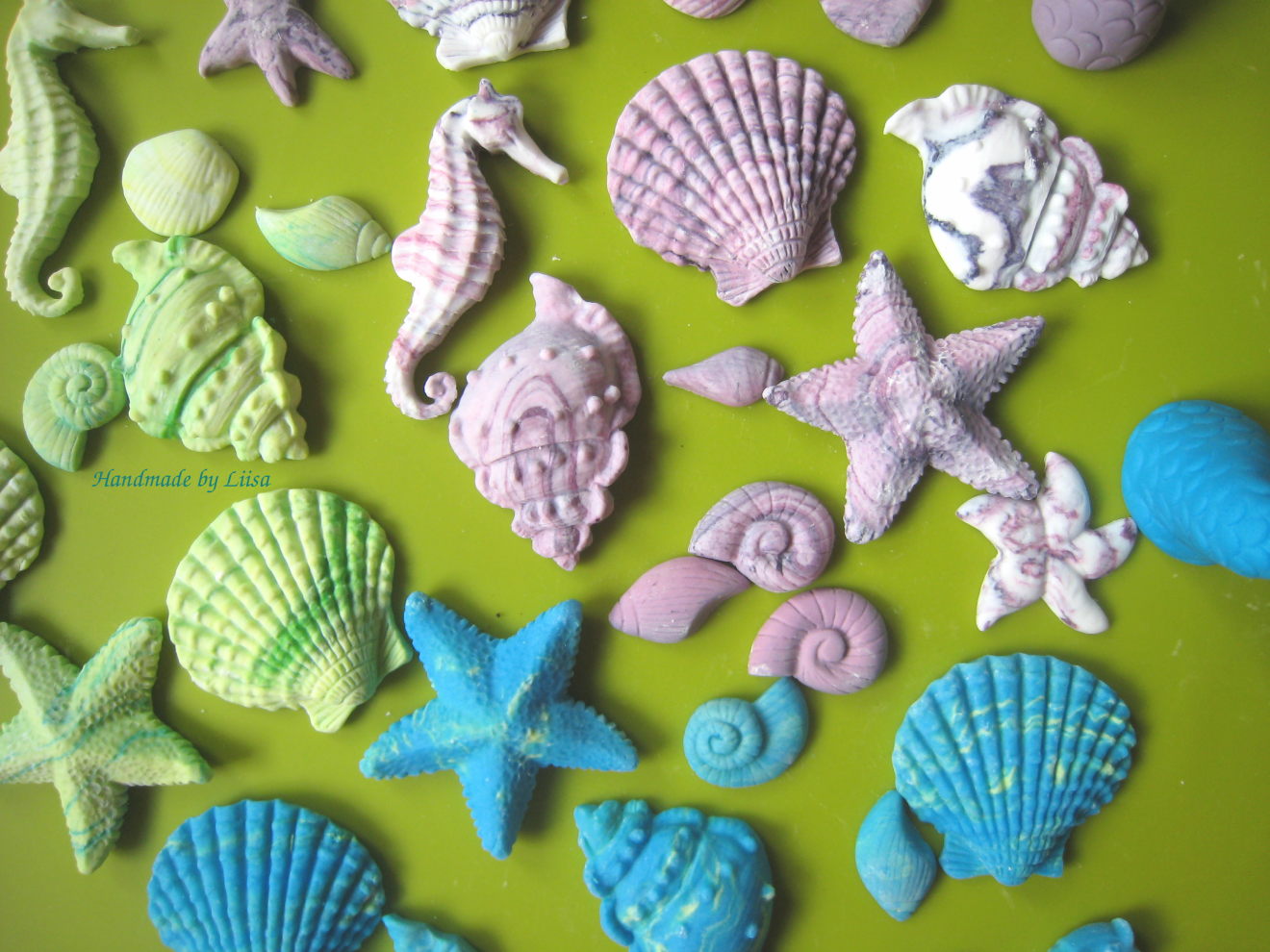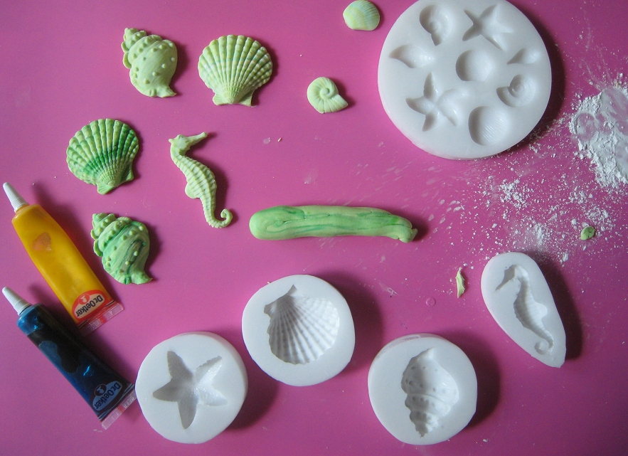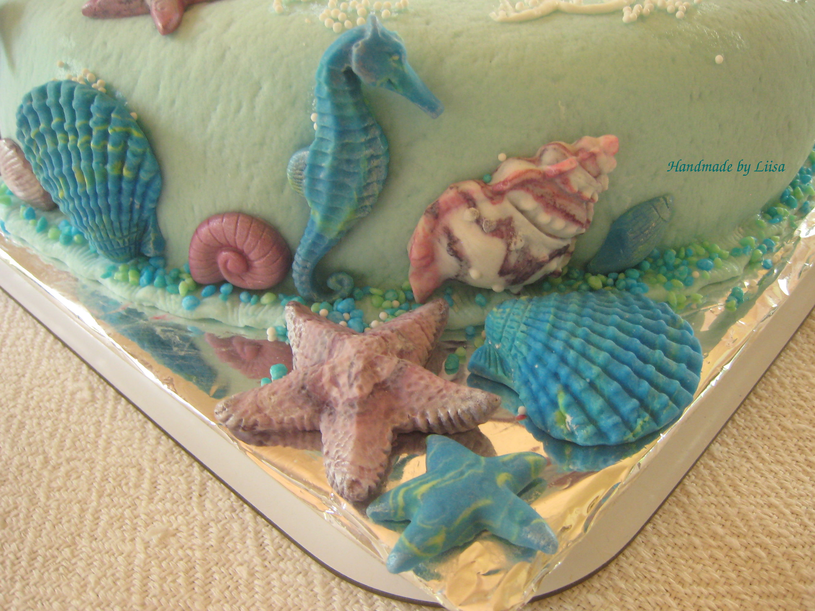 Ilmoittauduin kakunvalmistajaksi nuorten neitien syntymäpäiville testatakseni uusia silikonimuotteja. Tällä kertaa siis kesäinen meriaihe: vaaleansininen vaahtokarkkikuorrutus ja sokerimassasta tehtyjä koristeita. Ensin suunnittelin tekeväni päälle kaksi merenneitoa, mutta sitten kekkasin että pelkät pyrstöthän riittää.