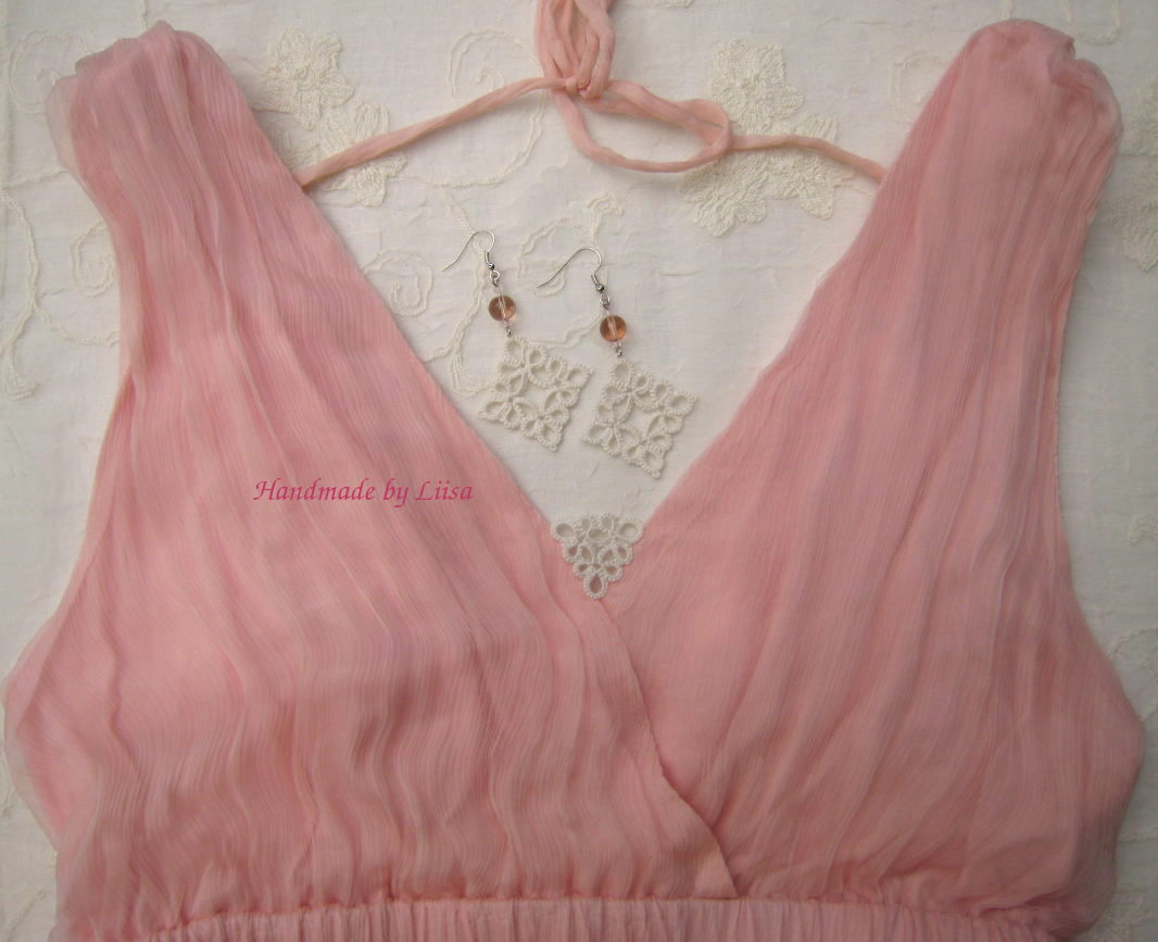 Ystävättäreni pyysi apua ihanan sikkimekkonsa avaran kaula-aukon pienentämiseksi. Avasin helman ja yläosan välisen sauman ja mallasin kappaleita sopivammiksi. Eteen lisäsin pienen pitsikoristeen pitämään osia yhdessä. Samalla tuli tehtyä korvakorut frivolité-pitsistä…