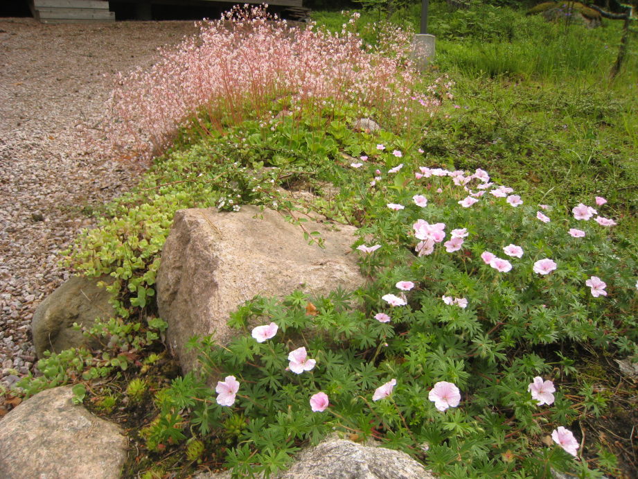 Sama vaaleanpunainen sävy on posliinirikon hennoissa kukinnoissa kivikkopuutarhassa. Etualalla pinkit neidonkurjenpolvet. Kurjenpolvia hankin tänä kesänä lisää montaa eri lajiketta, matalampia ja korkeampia. Toivoisin kovasti että ne leviäisivät ympäri puutarhaani, mutta saa nähdä miten käy… Välissä turkestaninmaksaruoho, joka kukkii myöhemmin kesällä – tietysti vaaleanpunaisena.
