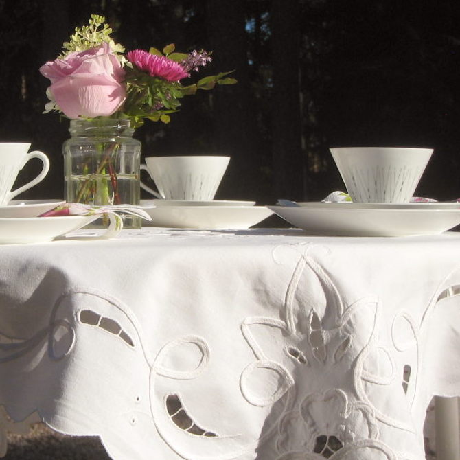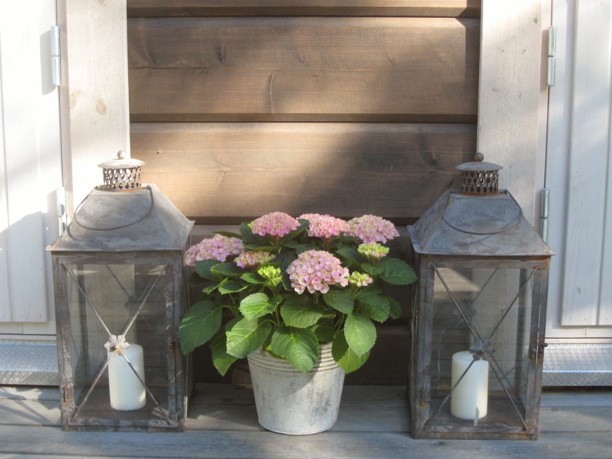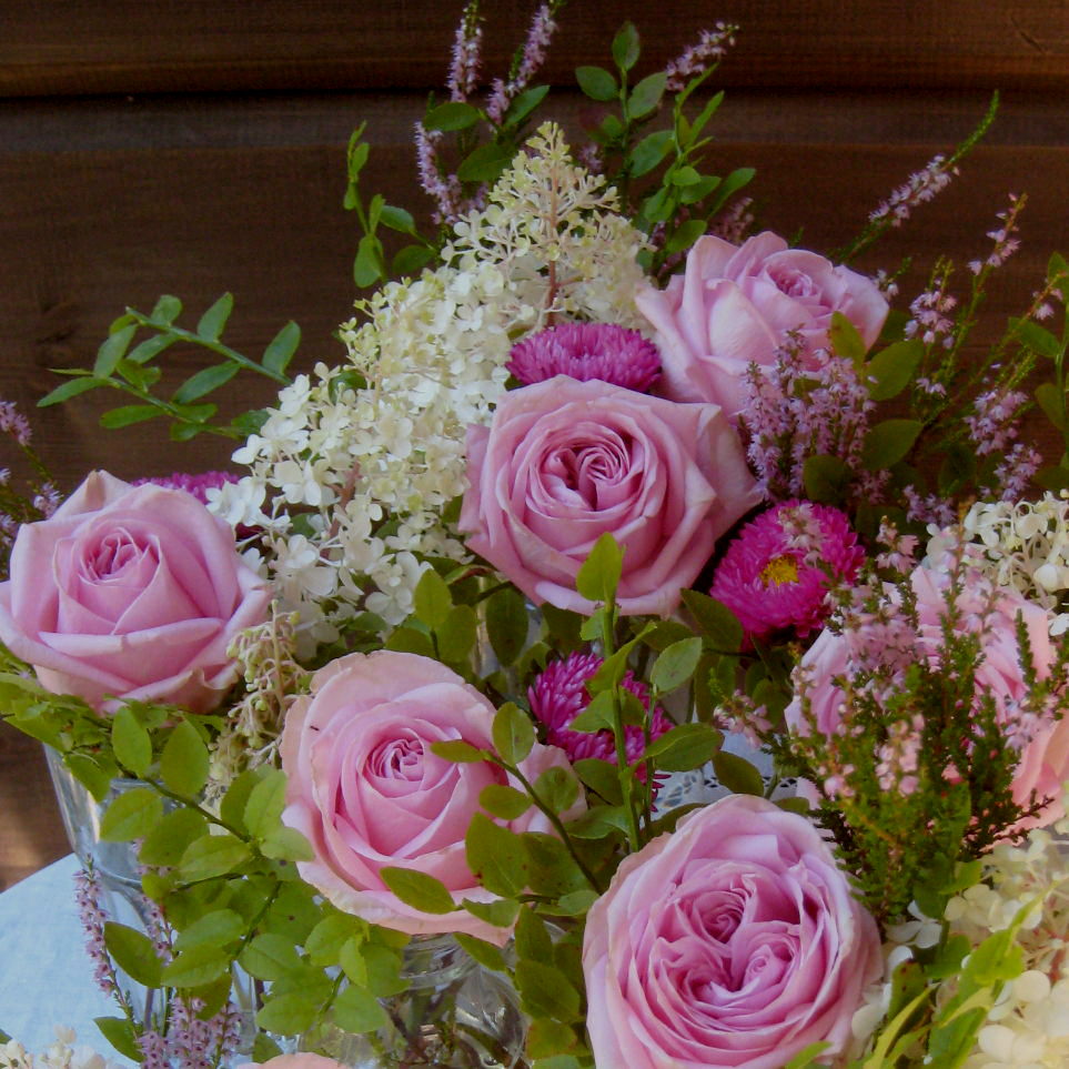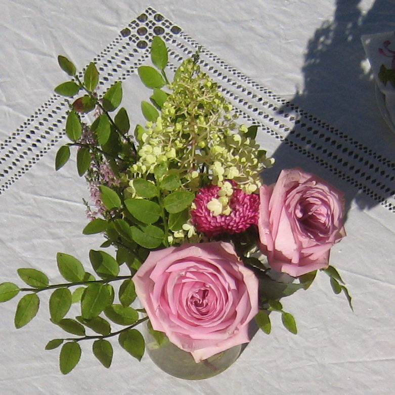 A graduation party in the family and the garden got dressed up for afternoon coffee 🙂 We bought one bouquet of pink roses and a couple of Aster flowers. Then added some white peegee hydrangeas, hydrangea paniculata `grandiflora` (a beautiful, hardy plant very popular here in my native Finland) with blueberry shrubs and heather from my own garden.