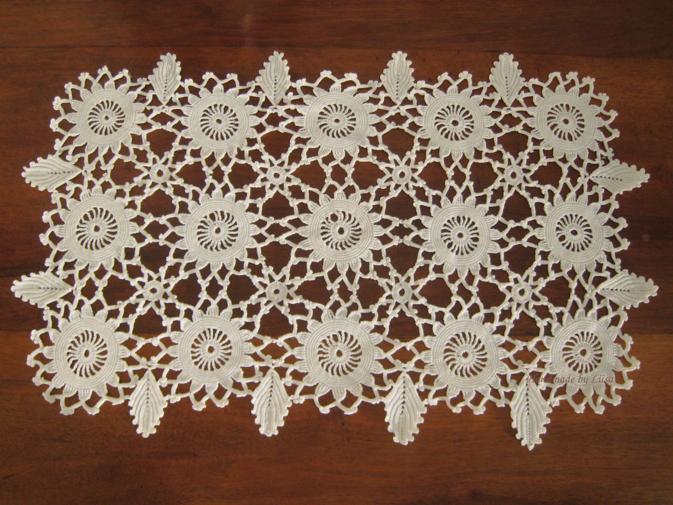 Crocheted linen, isompia ja pienempiä virkattuja liinavaatteita