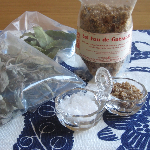 Herbs, like everything else, grow at quite another pace in France than in my native Finland. My favourite is sage, but also bunches of rosemary and bay leaves travel back home in the suitcase. Some are dried, some put in the freezer. The sweet little salt holder is a find from a local (French) brocante. The brown salt, flavoured with onions and a little pepper is a present from my son who spent last year in St. Nazaire, next to Guérande.
