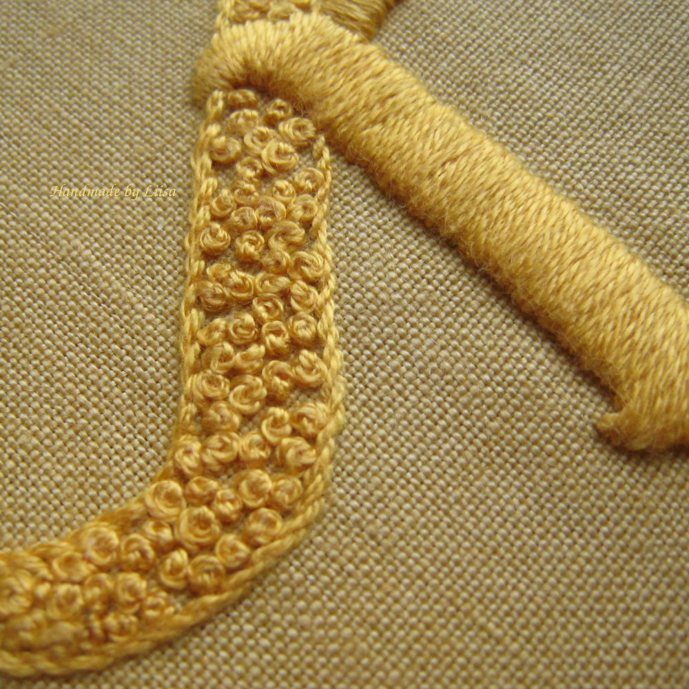 The napkin fabric is a 100% linen and embroidered with DMC Mouliné cotton, using two threads. The different textures of the initials make quite a nice touch and I especially like the French knots of the J. These are the first ones of a set of eight, each one still a little different (i.e. not perfect!), but with practice…