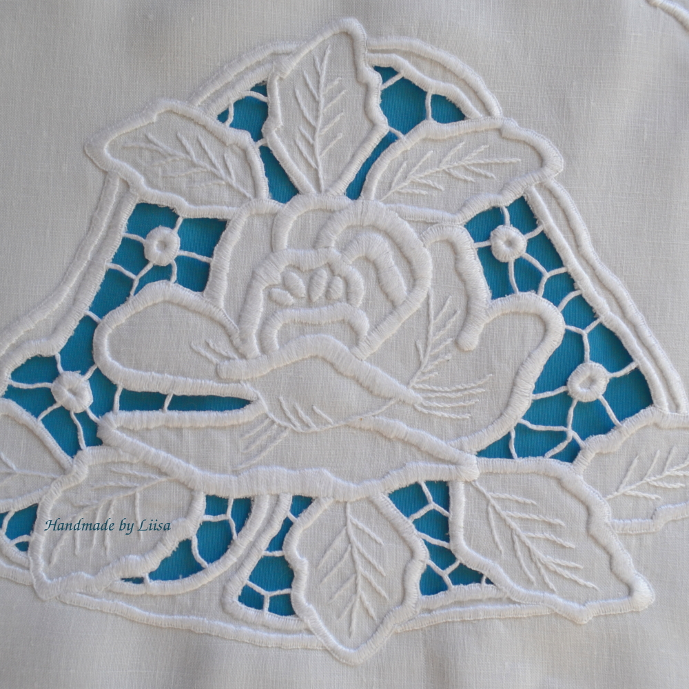 Whitework tea cosy, valkokirjontapannumyssy vanhan mallin mukaan