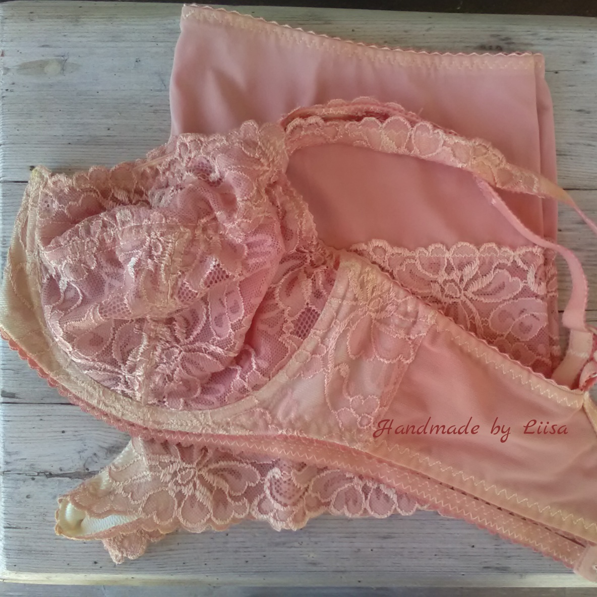 The first batch which was in the dye bath for just a couple of minutes resulted in the orangy colour you can see in the picture below. For the second set (the dye bath of which you can see in the picture above) I added more pink and got the really vibrant coral pink in the bottom right-hand corner. Next I poured most of the dye out and added water to dilute the solution. I quickly dipped in the pants of the next set for a soft dusty rose and then the bra separately. Not a very good result since the lace wasn’t taking the dye at all and I had to keep the bra in the liquid a lot longer to get a hint of the pink to stick. This resulted in the spandex and elastics being completely “pinked” so the bra is two coloured. Last I had a lace set that I knew would absorb the colour well. I went for a very diluted dye bath, which resulted in a baby pink, not quite my thing… So I added a tiny bit of grey I had saved from an earlier project and got the light lilac colour. Last I dipped the first orange set in again which changed it a little more towards the salmon pink I think I prefer.
