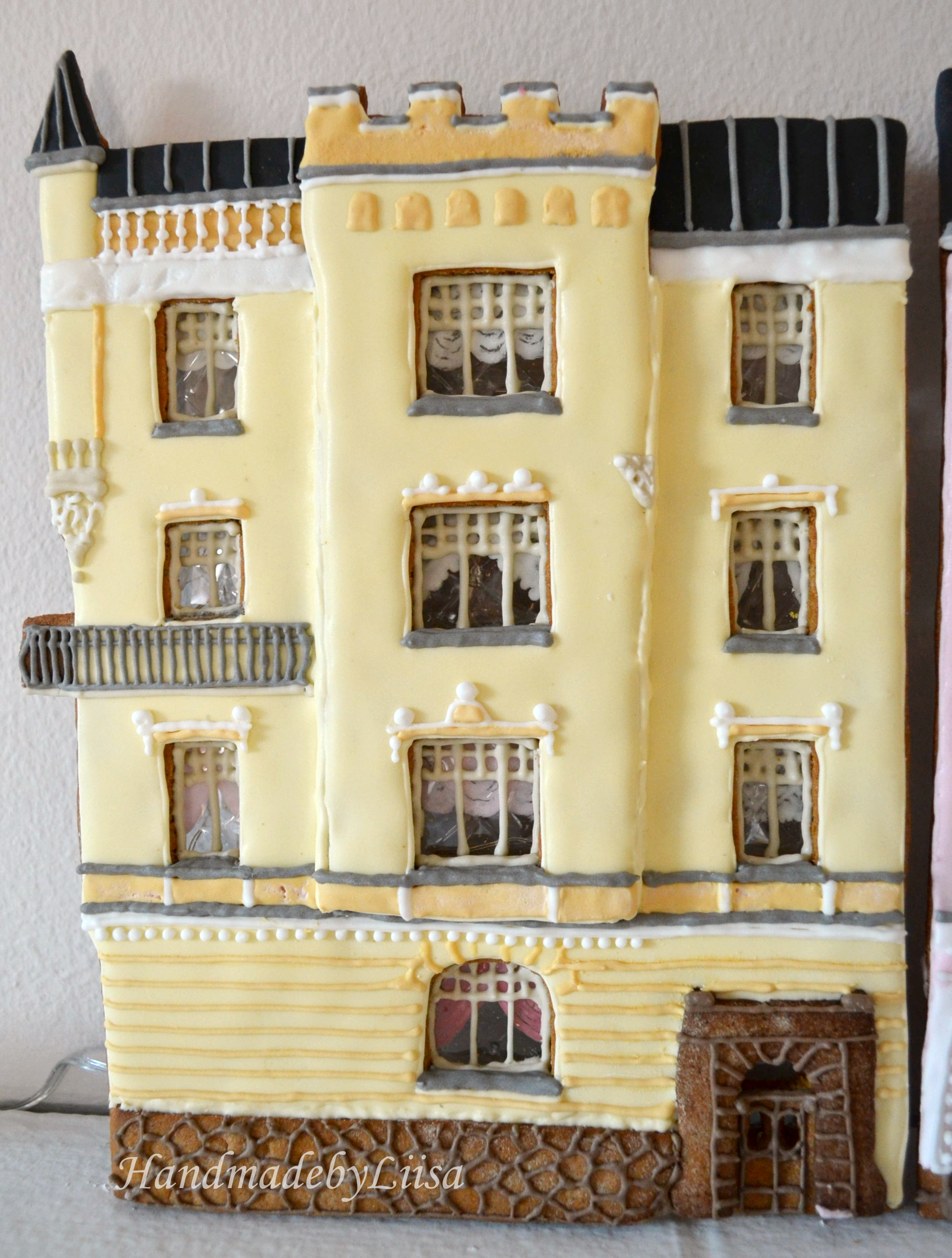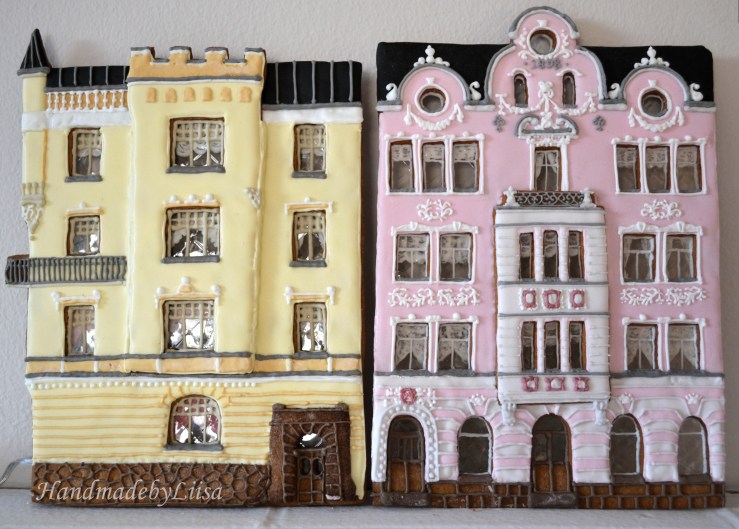Katson kaunista kotikaupunkiani Helsinkiä aina piparkakkutaloaihiot mielessä. Parin välivuoden jälkeen rakensin parista lempitalostani vähän helpommat versiot eli pelkät julkisivut, tai tarkemmin julkisivujen osat. Sattumalta (🤔) talot ovat saman kuuluisan arkkitehtitoimiston suunnittelemat (Grahn, Hedman & Wasastjerna) ja hyvin saman ikäiset. Vaaleanpunainen talo Annankadun ja Kalevankadun kulmassa on valmistunut 1898 ja kellertävä Vironkadun ja Mariankadun kulmassa parisen vuotta myöhemmin 1901.