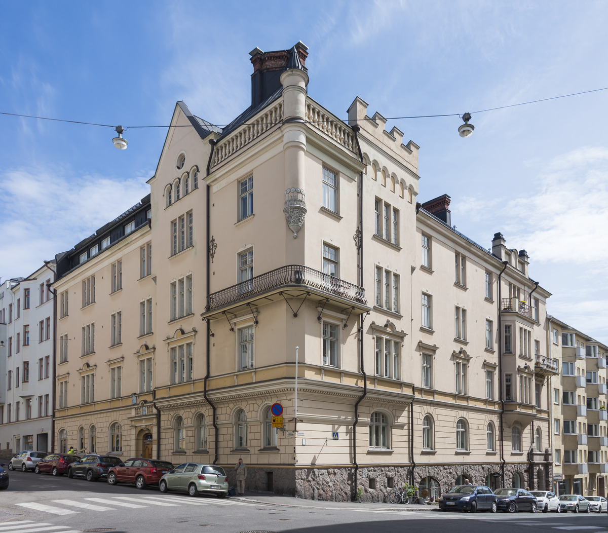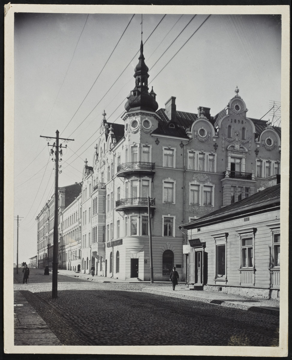 This pink beauty has an unusual amount of stuccowork. Some of the original decorative elements have been removed in renovations but the house still has an imposing tower in the corner with two beautiful balconies. The house is in the town center, corner of Annankatu and Kalevankatu.