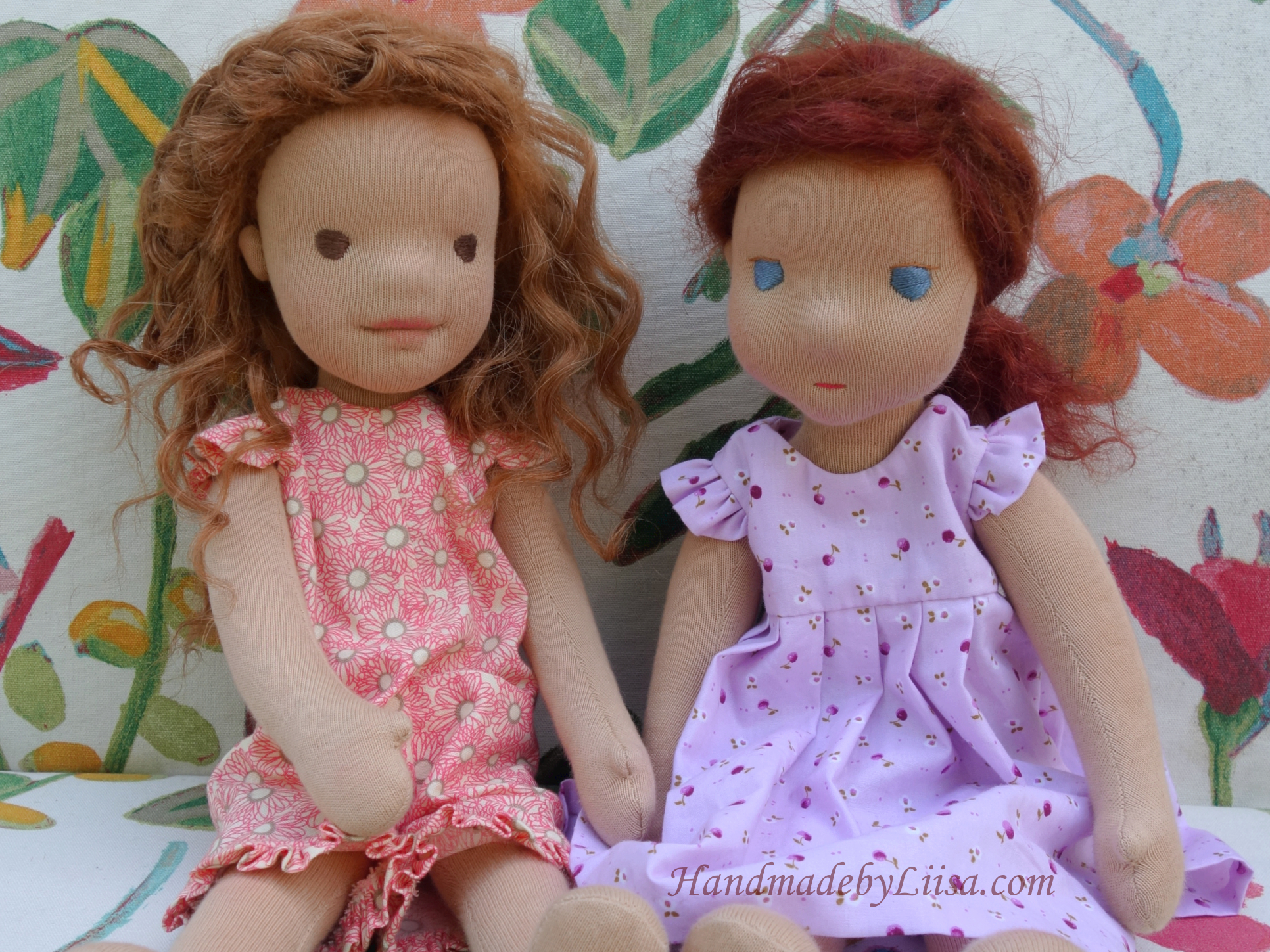 Muillekin nukeille tehtiin uusia kesävaatteita, käsin ompelemalla kun kerran maalla oltiin. Rimpsuhihat ja -lahkeet oli kaikkien mieleen. Kiti-nukke, tästä aikaisemmasta postauksesta, on vähän kadehtinut Fillan kuohkeaa kampausta (nimi lastenlasten keksimä 🥰), joten päätimme että Kitillekin lisätään vähän kiharoita. “Tukka hyvin kaikki hyvin” opin jo pienenä, ja aikamoinen muodonmuutoshan se olikin!