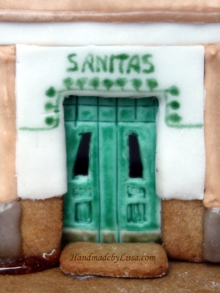 This year’s gingerbread house is a (slightly diminished) three storey apartment house in the corner of one of the most photographed streets of Helsinki, Huvilakatu. Built in 1905 it also served as a private hospital, hence the name ‘Sanitas’. Last year it was covered up in scaffolding and reappeared all the more illustrious. Many fine old buildings in our neighbourhood have been renovated and restored to their full splendour. It’s been such a joy to see!