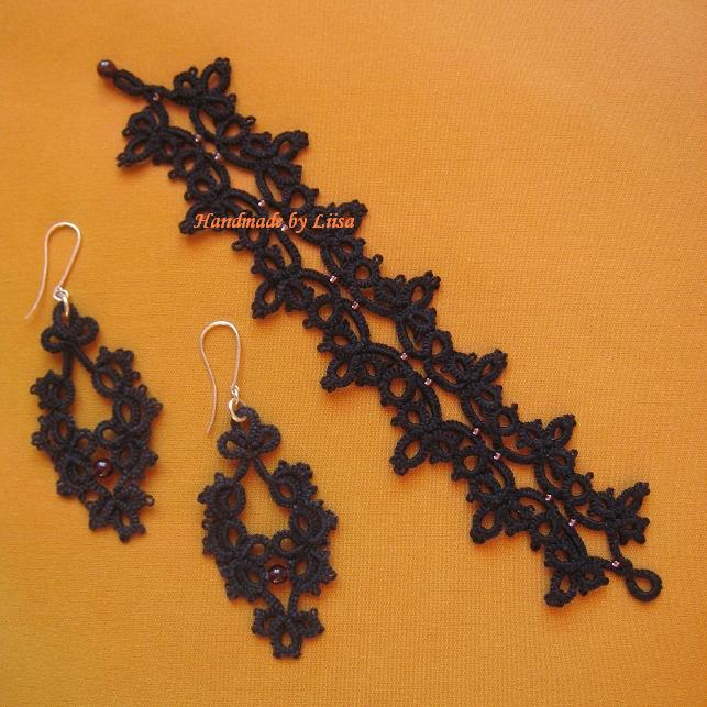 Tatted lace earrings and bracelet, käpypitsikorvakorut ja -rannerengas