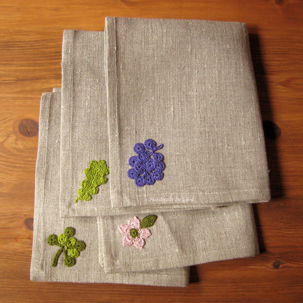 Here are some little crocheted motifs to mark linen towels with. We use these as seat covers for the sauna, so it was an appropriate gift to take to our friends' summer cottage 🙂 * Kesätuliaisiksi ystäville vietiin pienillä virkatuilla kuvioilla koristellut pellavaiset laudeliinat. The oak leaf is a design I found on Charlotta's crohet… Continue reading Personalized linen, yksilöidyt laudeliinat