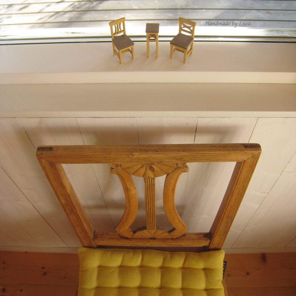 I'm furnishing a country living room 😉 and couldn't resist buying these lovely little dolls' house chairs when I spotted them in a gift shop. A little family run business makes them from plywood. They are ready cut for you to assemble, which means they're sold in very handy flat packages. I painted my Gustavian… Continue reading Dolls’ house furniture, nukkekodin kalusteita