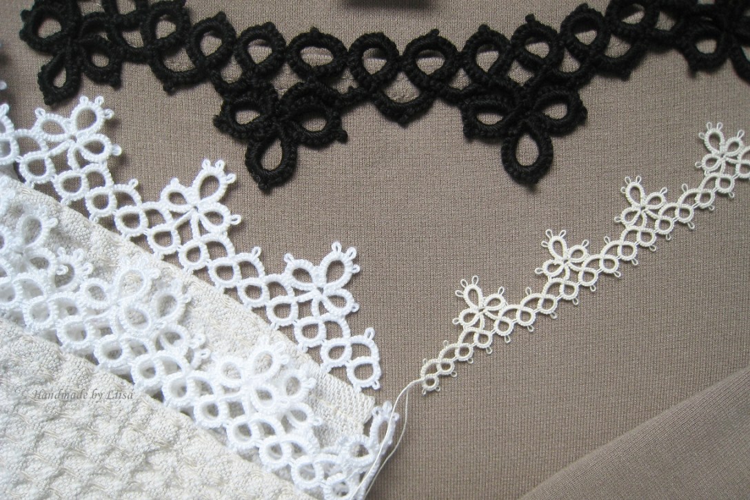* More lace edgings - tatted this time. All three are made with the same pattern. The largest, black lace with thick cotton yarn and a needle. The middle one sewed onto the little linen towel is shuttle tatted in a soft mercerised crochet cotton (needle size 1,25-1,5 mm) and the smallest a try to… Continue reading Frivolité edgings, käpypitsireunuksia