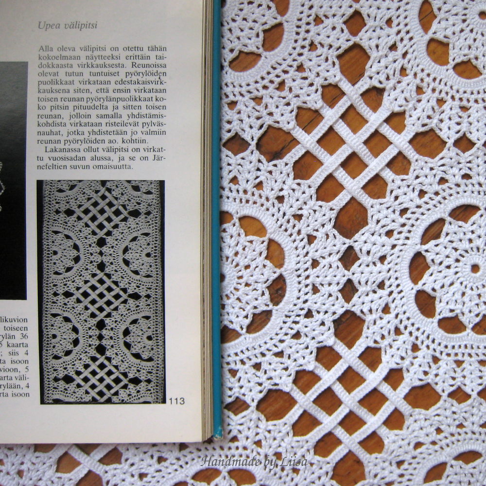 The elaborate lace in this old book has once adorned the sheet of some noblewoman. The pattern I found for the crocheted tablecloth is nearly the same with the crocheted bands forming an intriguing trellis between the rounds. This is one work I dug out of the unfinished objects' basket and finally sewed together. *… Continue reading Lace tablecloth, pitsipöytäliina
